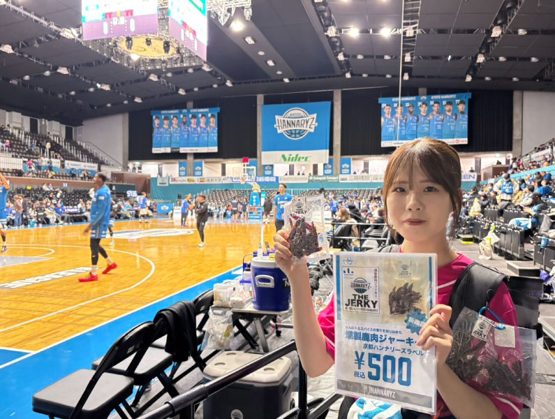 京都ハンナリーズでは、府内各地で環境保全活動や社会課題解決のサポートに取り組む「NEKONOTE PROJECT」を進めています。その中でRE-SOCIALさんと出会い「ジビエの消費拡大による獣害被害の解決」という理念に共感するとともに、「鹿肉のおいしさ」をより多くの方に知っていただきたい思い、試合会場で「燻製鹿肉ジャーキー」の販売を開始しました。ビールのおつまみとして多くのお客様にご利用いただいています。